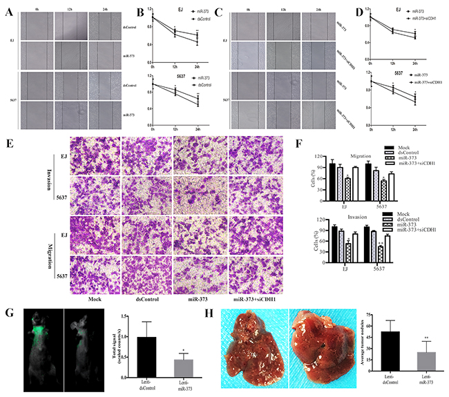 Figure 7: MiR-373 suppresses BCa cells migration and invasion. EJ and 5637 cells were transfected with 50 nM of miR-373 and dsControl for 72 h. (A and C) Representative wound healing images were pictured at 0, 12 and 24 h. (B and D) The relative distances between wound edges of BCa cells at 0, 12 and 24 h. MiR-373 led to retarded wound closing compared with dsControl group from 12h in both EJ and 5637 cells. While siCDH1 co-transfected EJ and 5637 cells recovered to close the wound faster within 24h compared to miR-373 treatment alone (*P<0.05, **P<0.01). (E) Representative photographs of transwell assay (×200). (F) Number of migrated and invaded cells was quantified. Results are plotted as percent (%) relative to dsControl group. MiR-373 exerted a potent inhibiting effect on migration and invasion of the both cell lines (*P<0.05, **P<0.01). And depletion of E-cadherin dramatically restored cells invasion and migration capacity (*P<0.05). (G) Representative bioluminescent images of lungs of nude mice at the 30th days after intravenous injection. Quantification analysis of fluorescence signal from captured bioluminescence images. *P<0.05 compared to Lenti-dsControl group. (H) Representative photographs of metastatic nodules in the liver. Number of nodules was quantified. **P<0.01 compared to Lenti-dsControl group.