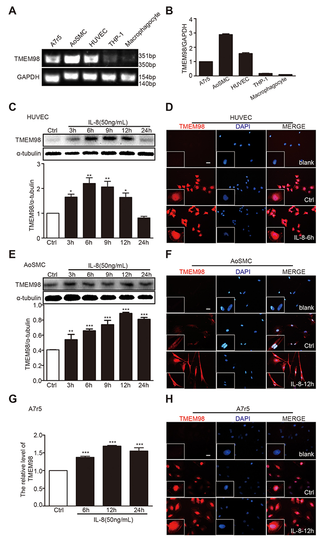 Figure 2: The expression of TMEM98 after treatment with IL-8 in HUVEC, AoSMC and A7r5. RT-PCR was performed to demonstrate TMEM98 expression in various cell lines (A) The graphic showed the statistical data of Figure 2A (B) HUVEC (C and D), AoSMC (E and F), and A7r5 cells (G and H) were treated with IL-8 at the indicated time lines (C-H). The cell lysates were analyzed by Western blotting using anti-TMEM98 antibody (C and E). mRNA level of TMEM98 was analyzed by real time RT-PCR (G) Immunofluorescence staining confirmed the level and location of TMEM98 (D, F and H). The results were quantified and plotted in the bar graph and were expressed as the means ± SD (n=3). *p<0.05, **p<0.01, ***p<0.001 compared with the control group. Bars=100μm.