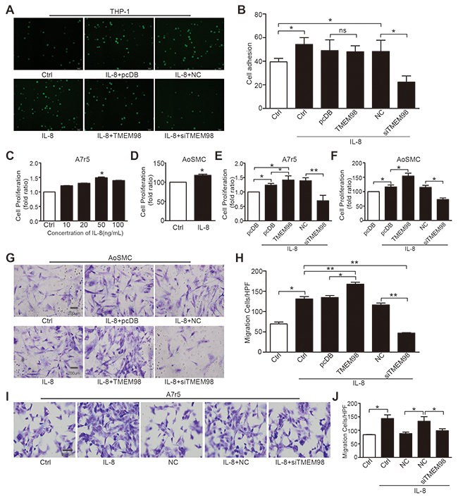 siRNA-TMEM98 can decrease IL-8-mediated the adhesion of monocytes to ECs as well as the proliferation and migration of VSMCs
