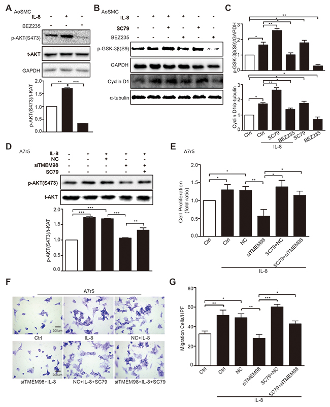 Figure 6: Effects of AKT signal pathway on IL-8-induced VSMC proliferation and migration with siRNA-TMEM98 treatment. The activation status of p-AKT (S473) was detected after treatment with IL-8 and BEZ235 (PI3K inhibitor) by western blot (A). The effects of SC79 and BEZ235 on the p-GSK-3β and Cyclin D1 in AoSMC cells by western blot (B). The graphic showed the statistical data of Figure 6B (C). Western blot was used to examine the activation status of p-AKT (S473) dealt with SC79 (AKT agonist) and (or) siRNA-TMEM98 in IL-8-treated A7r5 (D). MTT and Boyden Chamber assay were assessed the proliferation and migration of IL-8-treated A7r5 cells dealt with SC79 and (or) siRNA-TMEM98 (E-G). All results were mean ± SD (n=3). *p<0.05, **p<0.01, ***p<0.001 vs control.