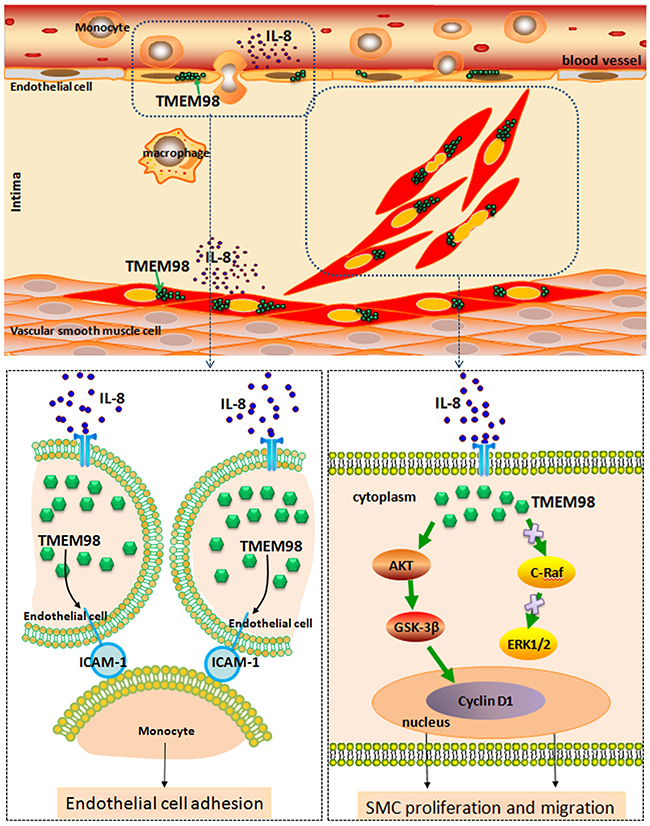 siRNA-TMEM98 can inhibit IL-8 mediated ECs adhesion by down-regulating the expression of ICAM-1 and it also hinders the proliferation and migration of VSMCs through suppressing the AKT/GSK3β/Cyclin D1 signaling pathway