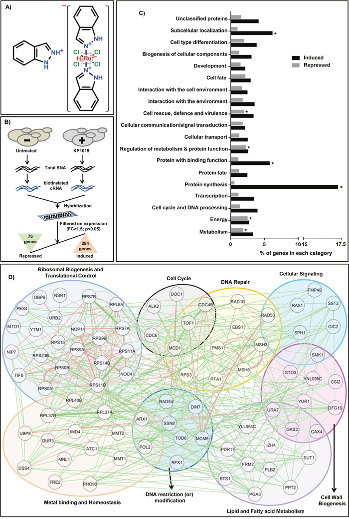 Figure 1: Global transcriptomics analysis upon KP1019 treatment. (A) Chemical structure of KP1019 (Indazolium trans-[tetrachlorobis(1H-indazole)ruthenate (III)]). (B) Schematic representation of the procedure followed for the microarray analysis of yeast cells after KP1019 treatment. Total RNAs were extracted from wild-type cells (W1588-4C) that were left untreated (DMSO control) or treated with KP1019 (50μg/ml; 3h), and then hybridized to yeast genome GeneChip arrays according to standard Affymetrix protocol. KP1019 treatment leads to significant upregulation of 284 genes and downregulation of 76 genes (P<0.05; fold change>1.5). (C) Functional classification of KP1019 transcriptome according to MIPS (The Munich Information Center for Protein Sequences) showed significant (*P<0.05) enrichment of genes coding for cellular rescue/defense, metabolism, energy, and protein synthesis, etc. (D) Regulatory network analysis by GENEMANIA tool showed the reported genetic (green) and protein interactions (pink) exist among different genes induced by KP1019. The genes were clustered based on their functional role in various cellular processes including cell cycle, DNA repair, cell signaling, ribosomal biogenesis, lipid and metal homeostasis.