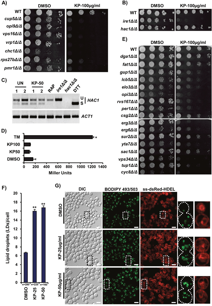 Figure 3: KP1019 treatment causes lipid droplets (LDs) accumulation. (A and B) The gene products involved in Ca2+ ion homeostasis (A) and Ire1 kinase involved in unfolded protein response (UPR) are required for KP1019 tolerance (B). Ten-fold serial dilutions of WT and indicated mutants were spotted in absence or presence of KP1019 and the growth was monitored after 48h. (C) KP1019 does not induce maturation of HAC1 mRNA. Total RNAs isolated from the wild-type (W1588-4C) cells that were left untreated or treated with KP (50μg/ml; 3h), rapamycin-RAP (200nM; 3h), and dithiothreitol-DTT (2mM; 1h) were reverse transcribed to cDNA. The maturation of HAC1 was assessed by detecting levels of both the unspliced (U) and spliced (S) forms of HAC1 mRNA using intron-specific splicing primers. Cells treated with DTT, an ER stress inducer were served as a positive control, whereas ire1Δ cells were served as a negative control. hac1Δ cells were used to check the specificity of primers used. ACTIN levels were used as control. (D) KP1019 does not alter UPRE activity. The wild-type (BY4741) yeast cells harboring UPRE::lacZ reporter plasmid were grown to exponential phase and then left untreated (DMSO solvent control) or treated with KP1019 (50, 100μg/ml) for 3h and Tunicamycin-TM (1μg/ml; 1h). β-galactosidase activity was measured using ONPG as a substrate and represented the results in terms of Miller units. The results are Mean±SEM, from two independent experiments each performed in triplicate. *P<0.05 considered significant compared to DMSO control (Student’s t-test). (E) KP1019 alters lipid homeostasis, and the null mutants of genes involved in lipid biosynthesis and metabolism are sensitive to KP1019. Ten-fold serial dilutions of WT and indicated mutants were spotted in absence or presence of KP1019 (100μg/ml) and the growth was monitored after 48h. (F) Quantification of KP1019-induced LDs formation in yeast cells. The wild-type (BY4743) yeast cells were grown to exponential phase and left untreated (DMSO control) or treated with KP1019 (25, 50μg/ml) for 3h, then stained with BODIPY 493/503 dye to visualize the LDs under ApoTome microscope. The LDs stained with BODIPY 493/503 in ApoTome images were counted and represented as the number of LDs per cell (Mean ± SEM; n=280 for DMSO, 225 for KP25, and 160 for KP50). **P<0.001 (compared to DMSO control) were considered significant (Student’s t-test). (G) KP1019 treatment induces accumulation of LDs in yeast cells without altering ER architecture. Wild-type yeast cells harboring ss-DsRed-HDEL reporter (stains both cortical and nuclear ER) were grown to exponential phase and left untreated (DMSO control) or treated with KP1019 (25, 50μg/ml) for 6h, then stained with BODIPY 493/503 dye to visualize the LDs. Cells treated with KP1019 had shown increased cell size and the number of LDs (compared to control) with retaining the intact cortical and nuclear (‘bowtie’ shaped) ER architecture. The representative images from three independent experiments were shown. Scale bar represents 5μm.