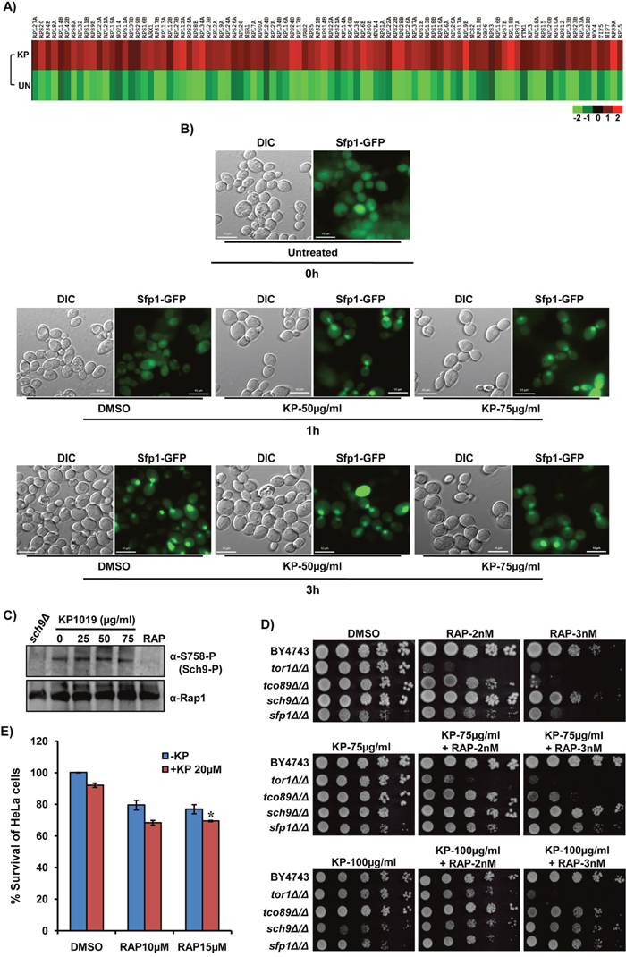 Figure 5: KP1019 treatment induces ribosomal biogenesis genes and modulates the effect of Rapamycin, an inhibitor of TOR pathway. (A) Gene expression profile (heat map) of ribosomal biogenesis and translational control genes upon KP1019 (50μg/ml) treatment. The average normalized expression values (log2) for each gene from two independent experiments were illustrated by red-green color scale. (B) KP1019 treatment induces the early nuclear localization of Sfp1, a critical regulator of ribosomal biogenesis genes. Wild-type (BY4743) cells harboring GFP-tagged Sfp1 were grown to early exponential phase (OD600: 0.8-1) and left untreated (DMSO) or treated with KP1019 (50, 75μg/ml). The localization of Sfp1 was monitored after 1h and 3h of KP1019 treatment using ApoTome microscope. The KP1019 treated cells known to have nuclei spanning bud neck (‘bowtie’ phenotype) and the bowtie-shaped Sfp1-GFP signals upon KP1019 treatment indicates its nuclear localization. The representative images from three independent experiments were shown. Scale bar represents 10μm. (C) TOR pathway is functional/active in cells treated with KP1019 as indicated by Sch9 phosphorylation. The exponentially growing wild-type (BY4743) yeast cells were left untreated or treated with KP1019 (25, 50, and 75μg/ml) and rapamycin (200nM; RAP) for 3h. The whole-cell protein extracts were subjected to immunoblotting analysis of Sch9 phosphorylation using Anti-S758-P antibody. Anti-Rap1 signals were served as the control for checking protein loading. The sch9Δ and RAP-treated cells were used as negative controls. (D) KP1019 antagonizes the effects of rapamycin (RAP), an inhibitor of the TOR pathway. Ten-fold serial dilutions of wild-type (BY4743) and indicated TOR pathway null mutants were spotted onto SC-agar plates supplemented with DMSO or KP1019 and RAP at an indicated doses in alone or the combination. The plates were imaged after 72h. (E) The cytotoxicity of KP1019 in HeLa cells was slightly enhanced in combination with RAP, an immunosuppressant. The viability of HeLa cells treated with KP019 (20μM) and RAP (10, 15μM) in alone or combination was analyzed by MTT assay, and the results were represented as % survival (compared to DMSO control). The values are Mean±SEM, from two independent experiments each performed in duplicate. *P<0.05 considered significant compared to DMSO control (Student’s t-test).