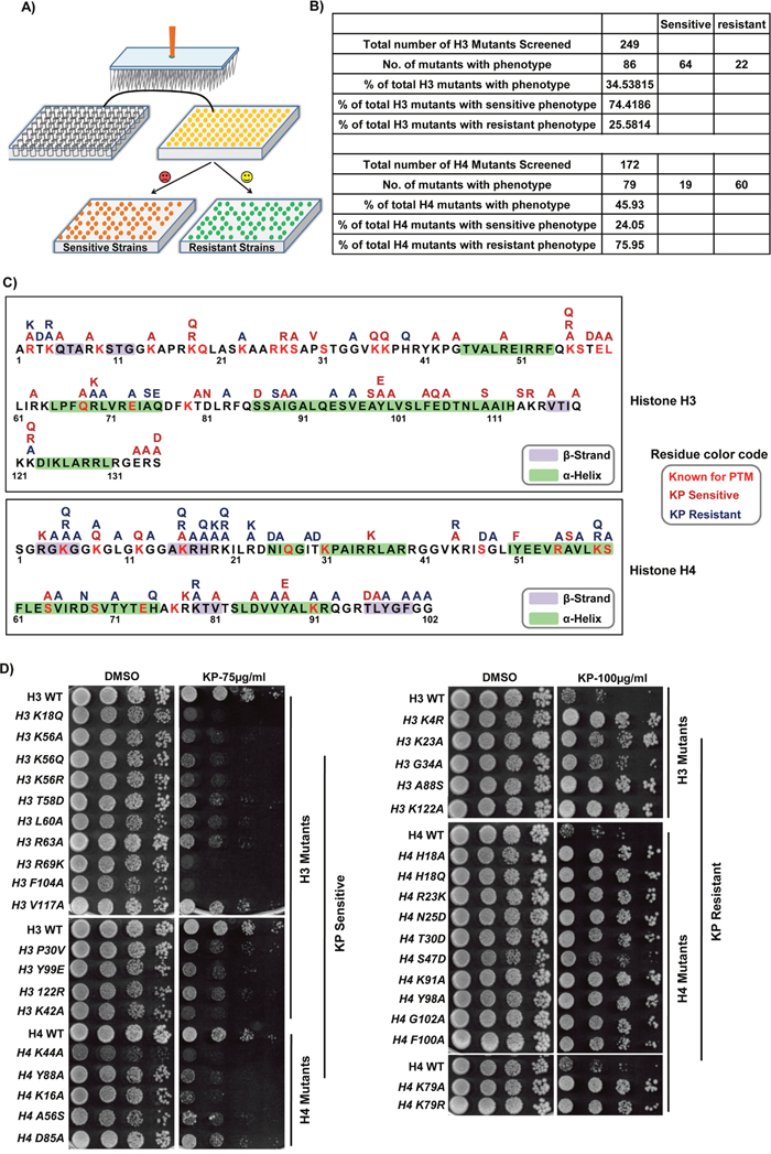 Figure 7: KP1019-induced toxicity is modulated by the mutations, loss or gain of PTMs on histone H3 and H4 residues. (A) Schematic representation of high-throughput methodology adopted for the screening of yeast synthetic histone H3/H4 mutant library to identify the KP1019 sensitive and resistant mutants. The library mutants were grown in 96-well plates and spotted onto SC-agar plates containing different doses of KP1019. (B) Summarization of histone H3/H4 mutant library screening results indicates that KP1019 is highly potent in inducing cytotoxicity in histone H3 mutants whereas ineffective in histone H4 mutants. 34.5% of tested histone H3 mutants and 45.93% of tested histone H4 mutants exhibited phenotype (sensitivity/resistance) to KP1019. (C) Substitution mutations indicated above the histone H3, and H4 sequence (yeast) are sensitive (brown) or resistant (blue) to KP1019. The residues that are known for their PTMs (red) and contribution to the secondary structure are indicated within the sequence (based on UniProt database). (D) Validation of top-scored mutants those exhibited phenotype to KP1019. Ten-fold serial dilutions of wild-type (WT) and indicated KP1019 sensitive and resistant histone H3/H4 mutants were spotted onto SC-agar plates supplemented with DMSO or KP1019 (75, 100μg/ml). The plates were imaged after 48h.