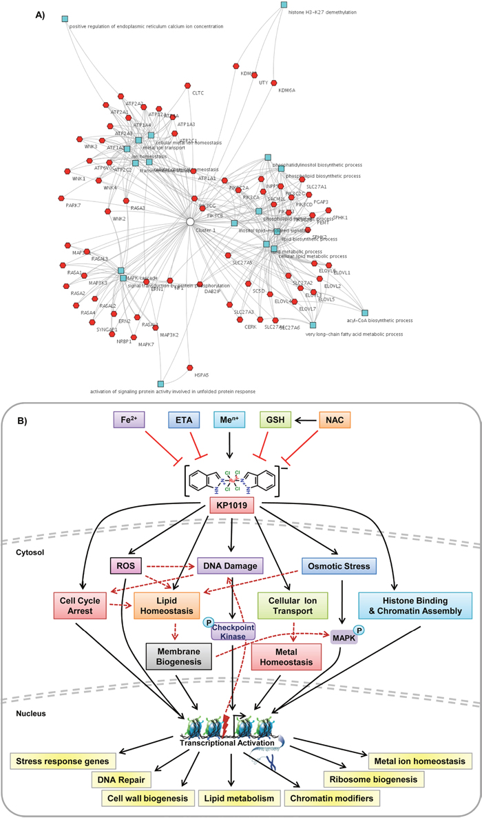 Figure 9: A proposed model depicting the mode of action of KP1019. (A) Functional classification of human homologous genes targeted by KP1019 in yeast using ToppCluster tool. (B) Model illustrating the mode of action of KP1019. Biologically active KP1019 induces ROS generation, causes DNA damage and thus cell cycle arrest, activates MAP kinase signaling, alters intracellular metal ion and lipid homeostasis, and also affects the chromatin assembly. The cells activate transcriptional response to alleviate KP1019 induced cellular damage. Moreover, the toxicity potential of KP1019 is enhanced in the presence of various metal ions (Men+), whereas suppressed by the supplementation of Fe2+ ions, reduced glutathione (GSH), N-acetylcysteine (NAC), and ethanolamine (ETA).