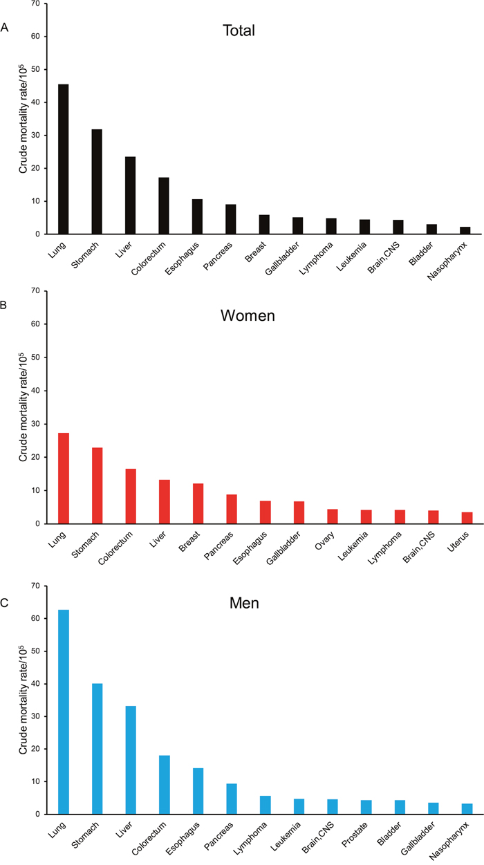 The 5 leading causes of cancer death were cancers of the lung & bronchus, stomach, liver, colon & rectum, and esophagus, accounting for 67.50% of all cancer death. Among men, the 5 leading causes of cancer death accounted for 73.43% of all cancer death. Cancer of the breast, rather than esophagus, was one of the 5 leading causes of cancer death among women. Figure 1 shows the first 13 causes of cancer death in the total or sex-stratified populations. Age-standardized mortality rate for all cancers combined was significantly higher in men than in women (153.1/105 vs. 88.8/105, P<0.001). Crude mortalities of cancers of the larynx, bladder, liver, nasopharynx, lung & bronchus, esophagus, lip oral & pharynx, stomach, kidney, and lymphoma were significantly higher in men than in women, with a male-to-female ratio of 6.45, 2.63, 2.50, 2.46, 2.29, 2.05, 1.76, 1.75, 1.54, and 1.35, respectively; the mortalities of cancers of the breast, thyroid, and gallbladder were significantly higher in women than in men, with a male-to-female ratio of 0.01, 0.44, and 0.53, respectively (Supplementary Table 1).