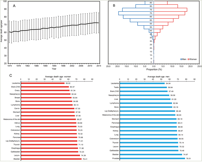 Average age of the residents died of cancers increased consecutively from 1974 to 2014 (Figure 2A). Cancer death peaked at 70-80 year old groups (70-75 years for men and 75-80 years for women) (Figure 2B). For most cancer types occurred in both sexes, men showed a significantly shorter life expectancy compared with women, except for those with stomach cancer (men vs. women: 68.2 vs. 67.6, P<0.001) (Figure 2C). Liver cancer was the leading cause of cancer death in men younger than 60 years old, followed by lung cancer and stomach cancer. The three cancer types were also the dominant causes of cancer death in men aged from 60 to 74 years. Stomach cancer was the leading cause of cancer death in women younger than 60 years, followed by lung cancer and breast cancer (Table 1). Most common cancer deaths occurred in the population aged from 60 to 74 years.