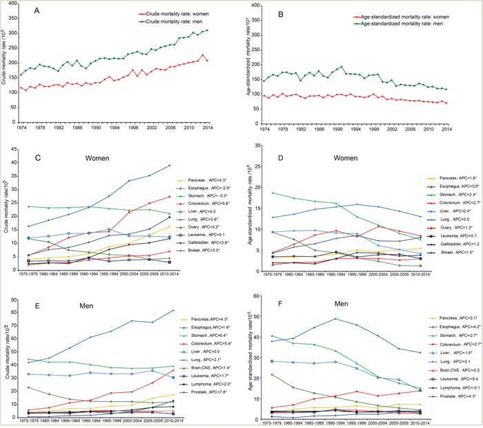 Information of cancer death during 1974-2014 was derived from the well-operated death registration system, covering all permanent residents in Yangpu, Shanghai. Cases were classified according to the 9th (1974-2001) and 10th (2002-2014) edition of International Classification of Disease codes. Yearly demographic data from 1994 to 2014 were obtained from the Public Security Bureau of Yangpu district. We did not extract personal information according to the regulations approved by the review board of Second Military Medical University.