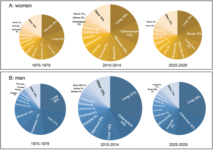 Figure 4: Pie charts of the most common causes of cancer death in women and men in 1975-1979, 2010-2014, and predicted in 2025-2029. The areas of the pies are proportional to the numbers of cases. (A) Scaled for women; (B) scaled for men.