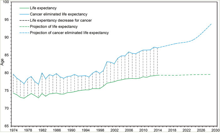Figure 5: Trends and projections of annual life expectancy and cancer-eliminated life expectancy in Yangpu, Shanghai, China. Trends: 1974-2014; projections: 2015-2029.