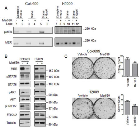 Figure 3: Mer590 inhibits ligand-dependent phosphorylation, activation of downstream signaling pathways, and colony formation in NSCLC cells. (A) Colo699 and H2009 cells were cultured in the absence (-) or presence (+) of 0.5 μg/ml Mer590 for 48 hours followed by 2 hours in growth media containing 10% (complete media, lanes 1,2,7, 8) or 0% fetal bovine serum (serum starve, lanes 3-6, 9-12) and with or without Mer590. Samples in lanes 5, 6, 11, and 12 were then stimulated with 200 nM rhGas6 for 10 minutes. All cultures were treated with 120 μM pervanadate prior to cell lysis in order to stabilize MER phosphorylation. MER was immunoprecipitated from lysates and samples were analyzed by western blot using phospho-specific and total MER antibodies. (B) Colo699 and H2009 cells were cultured for 24 hours in serum-free medium containing Mer590 (2 μg/ml) or PBS vehicle. 200 nM rmGas6 was added for 10 minutes and cell lysates were prepared. Phospho-STAT6, phospho-AKT, and phospho-ERK1/2 levels were determined by western blot. Blots were stripped and re-probed for total protein levels. (C) Colo699 and H2009 cells were treated with Mer590 (2 μg/ml) or vehicle control for 72 hours, then lifted, stained with trypan blue, and counted. One thousand live cells were re-plated in complete media without Mer590 and cultured. Colonies were stained with crystal violet and counted after 10 days. Mean and SEM from at least three independent experiments are shown in the histograms to the right (*P<0.05, **P<0.01).