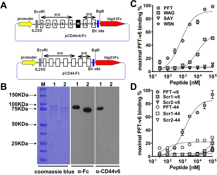 Figure 2: Characterization of peptide binding to recombinant CD44v6. (A) Schematic of recombinant CD44v6-Fc and CD44-Fc expression construct. The number of constant exons (1-5 and 15-17) are marked. (B) SDS-PAGE analysis and immunoblotting of purified CD44v6-Fc and CD44-Fc (M, BioRad precision plus all blue prestained protein standard; lane 1, CD44v6-Fc; lane 2, CD44-Fc). For SDS-PAGE analysis, the purified proteins were detected by coomassie blue staining. For immunoblotting, the mouse anti-human Fc Ab or mouse anti-human v6 region specific mAb VFF18 was used as the primary Ab and HRP conjugated goat anti-mouse Ab was used as the secondary Ab. (C) ELISA analysis of the dose dependent recombinant CD44v6-Fc binding ability of four biotinylated peptides. The peptides displayed on clone v6p1 (PFT), v6p3 (WAG), v6p8 (SAY) and v6p10 (WSN) were synthesized with a biotin label. The maximal ELISA absorbance value of PFT binding to CD44v6-Fc was used to normalize the binding signal of individual peptides. The specific binding curve was generated using GraphPad Prism 6.0 software and absolute Kd values were calculated using nonlinear regression. (D) The specificity of PFT binding to recombinant CD44v6-Fc. Different concentrations of PFT and its two scrambled peptide versions were incubated with immobilized CD44v6-Fc or CD44-Fc, respectively for ELISA analyses. The maximal ELISA absorbance value of PFT binding to CD44v6-Fc was used to normalize the binding signal of individual peptides. The specific binding curve was generated using GraphPad Prism 6.0 software.