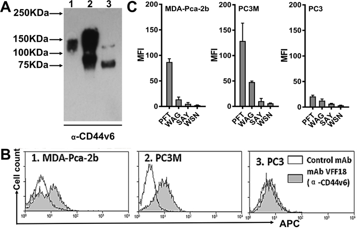 Figure 3: PFT binding to PCa cell lines. (A) Immunoblotting analysis of CD44v6 expression levels in three human PCa cell lines using the CD44v6-specific mAb VFF18. Lane 1, MDA-PCa-2b; Lane 2, PC3M; Lane 3, PC3. (B) A flow cytometry histogram plot of CD44v6 expression on the surface of the three PCa cell lines. The bound VFF18 (gray) or isotype control Ab (blank) were detected by APC conjugated secondary Ab. (C) Flow cytometry analysis of the binding of the four peptides (PFT, WAG, SAY and WSN) to the surface of the three PCa cell lines. The bound biotinylated peptides were detected by APC conjugated streptavidin. Bar graphs of quantitative MFI were used to compare the relative cell binding of the different peptides.