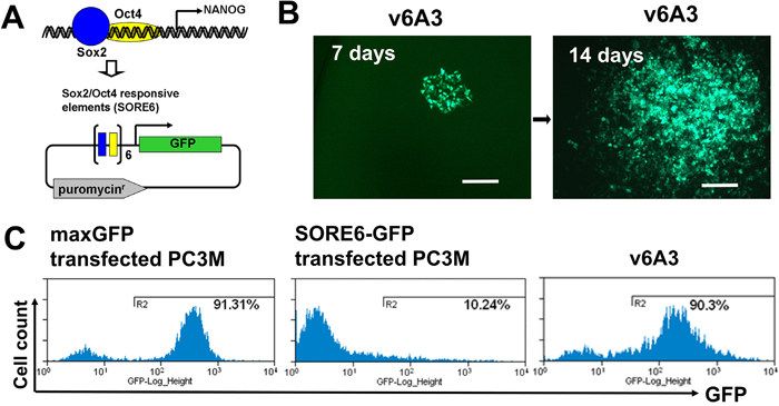 Figure 4: Establishment of v6A3 cell line. (A) A schematic diagram of SORE6-GFP vector. In this vector, the GFP reporter was designed to be driven by six concatenated repeats of SOX2/OCT4 response element (SORE6) of the NANOG promoter. (B) The morphology of a v6A3 colony at 7 and 14 days. PC3M cells stably transfected with the SORE6-GFP construct were further treated with DOX. After being diluted and inoculated into 96 wells, one DOX resistant and GFP positive holoclone (green), v6A3, was used as an aggressive PCa cell line. Scale bar, 150 μm. (C) GFP positivity revealed by flow cytometry. The histogram plots represent bulk PC3M cells transiently transfected by maxGFP (~91% GFP+) or SORE6-GFP (~10% GFP+), and v6A3 cells (~90% GFP+) after continuous passages for one month.