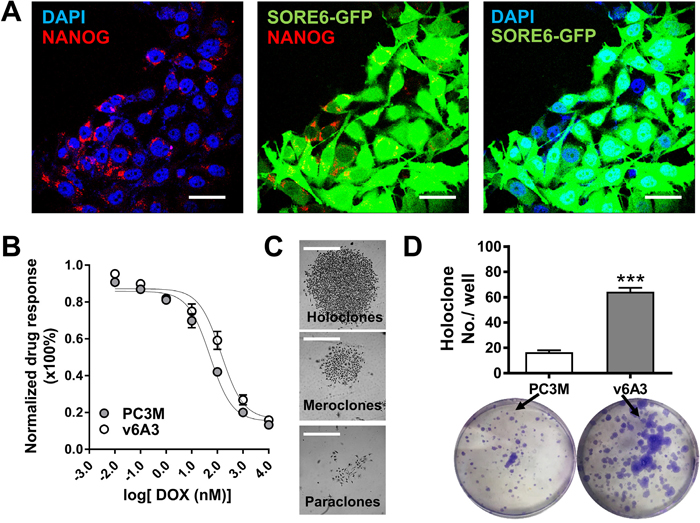 Figure 5: In vitro characterization of v6A3 cells. (A) Confocal immunofluorescence images of NANOG (red) and concordant GFP expression (green) in v6A3 cells. The positive perinuclear NANOG staining was detected by an anti-NANOG Ab and a PE conjugated secondary Ab. Cell nuclei were stained by DAPI (blue). Scale bar, 30 μm. (B) The DOX resistance of v6A3. An MTT assay was used to compare the response of PC3M (gray circle) with those of v6A3 (white circle) cells to DOX. A growth inhibition curve was generated using GraphPad Prism 6.0 software. Absolute IC50 values were calculated using the log inhibitor vs. response curves for nonlinear regression. (C) Representative colony morphology of holoclones, meroclones and paraclones formed by v6A3. Scale bar, 300 μm. (D) Colony formation assay of v6A3 (gray bar) and PC3M (white bar) cells. The number of holoclones observed per well was scored to determine the efficiency of colony formation. The data presented for each group are the averages with standard deviations from triplicate samples. ***, P < 0.001.