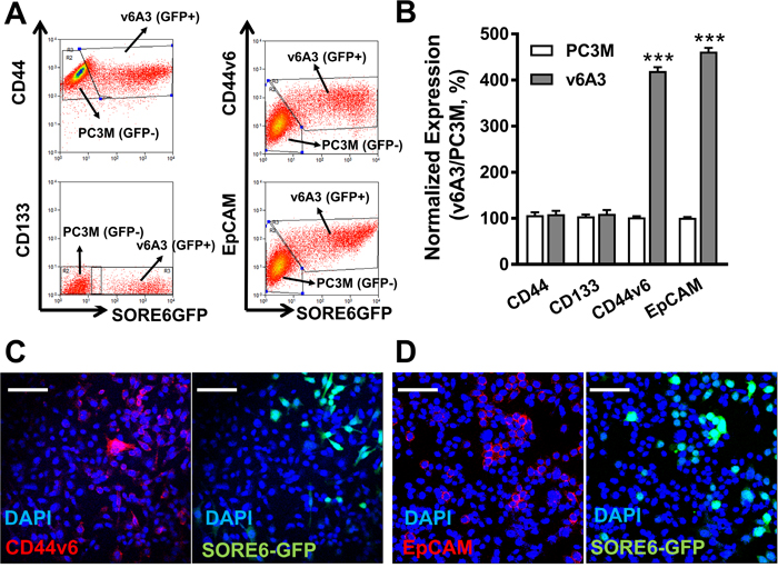Figure 6: CD44v6 highly expressed PC3M subpopulations enriched in v6A3 cells. (A) Flow cytometry analysis of the expression of CD44v6, EpCAM, CD44 and CD133 in a 1:1 mixture of PC3M (SORE6-GFP-) and v6A3 cells (SORE6-GFP+). Two gates were used based on the GFP signal (x axis) to separate PC3M and v6A3 cells. The cell bound primary Abs were detected by APC conjugated secondary Ab. The MFI of APC signal (y axis) detected from each gate was calculated to present the expression level of these four biomarkers. (B) The normalized expression levels of the four surface markers were calculated as the ratio of MFI of v6A3 (gray bar) to those of PC3M (white bar) cells. The data presented in each group are the averages with standard deviations from triplicate samples. ***, P < 0.001. Immunofluorescence confocal analysis of the expression of CD44v6 (C) and EpCAM (D) in mixed cultures of PC3M and v6A3 cells (green). The cell bound primary Abs were detected by PE conjugated secondary Ab (red). Cell nuclei were stained by DAPI (blue). Scale bar, 80 μm.