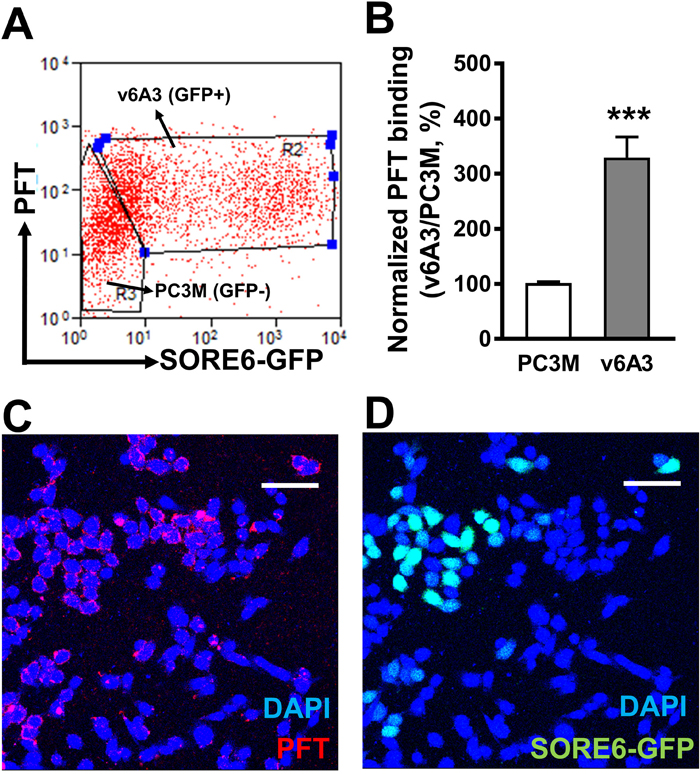 Figure 7: Specific binding of PFT to v6A3 cells in vitro. (A) Flow cytometry analysis of PFT binding to the 1:1 mixture of PC3M (SORE6-GFP-) and v6A3 (SORE6-GFP+) cells. Two gates were set up based on the GFP signal (x axis) to separate PC3M and v6A3 cells. The cell bound biotinylated peptides were detected by APC conjugated streptavidin. The MFI of APC signal (y axis) detected from each gate was calculated to present the PFT binding level. (B) Normalized PFT binding levels were calculated as the ratio of MFI of v6A3 (gray bar) to those of PC3M (white bar) cells. The data presented in each group are the averages with standard deviations from triplicate samples. ***, P < 0.001. (C) Confocal fluorescence microscopy assay of PFT binding in the mixed culture of PC3M and v6A3 cells (green). Cell bound biotinylated PFT was detected by PE conjugated streptavidin (red). Cell nuclei were stained by DAPI (blue). (D) Confocal fluorescence microscopy assay of GFP images of paraffin-embedded v6A3 tumor xenografts from mice. The SORE6-GFP positive cells (green) were stained by FITC-conjugated anti-GFP Ab and cell nuclei were stained by DAPI (blue). Scale bar, 50 μm.