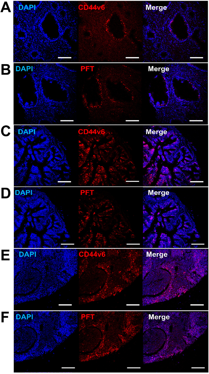 Figure 9: Detection of CD44v6 in PCa human TMAs using PFT peptide. Immunohistofluorescence confocal images of human TMAs. Shown are representative images of CD44v6 positive (A, C and E) and PFT positive (B, D and F) staining (red) observed in human PCa samples with different staging and grading, including T2N0M0 (grade II) (A and B), T4N1M1 (grade III) (C and D), and lymph nodes metastasis (E and F). The cell nuclei were stained by DAPI (blue), the bound VFF18 was detected by PE conjugated secondary Ab (red), and the bound biotinylated PFT was detected by PE conjugated streptavidin (red). Scale bar, 150 μm.