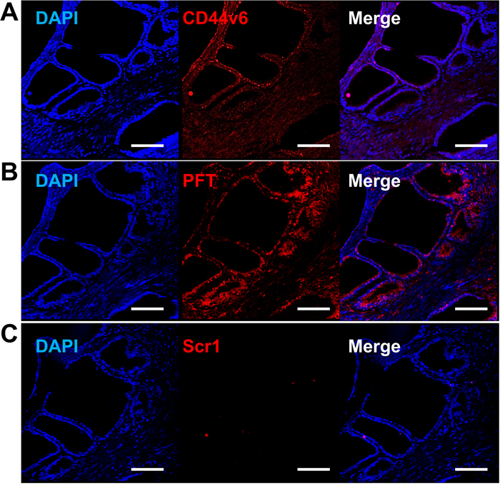 Figure 8: PFT staining of v6A3 xenografted tumor tissue. (A) Confocal images of paraffin-embedded v6A3 tumor xenografts from mice. The SORE6-GFP positive cells (green) were stained by FITC-conjugated anti-GFP Ab and cell nuclei were stained by DAPI (blue). Scale bar, 200 μm. (B) Confocal images of PFT staining in v6A3 xenografted tumor tissue. Bound biotinylated PFT was detected by PE conjugated streptavidin (red). The cell nuclei were stained by DAPI (blue) and SORE6-GFP positive cells (green) were stained by FITC conjugated anti-GFP Ab. Scale bar, 50 μm.