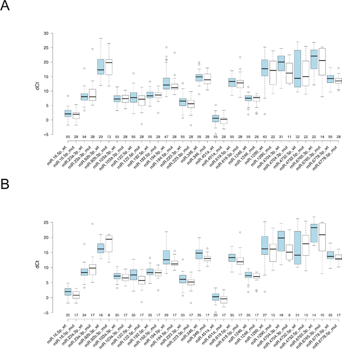 For miRNA quantitative RT-PCR assay, we used the Locked Nucleic Acid (LNA)-based miRNA qPCR platform from Exiqon: hsa-miR-16-5p, hsa-miR-23a-3p, hsa-miR-92b-3p, hsa-miR-103a-3p, hsa-miR-122-5p, hsa-miR-192-5p, hsa-miR-223-3p, hsa-miR-346, hsa-miR-451a, hsa-miR-619-5p, hsa-miR-1246, hsa-miR-1290, hsa-miR-4704-3p, hsa-miR-4732-5p, hsa-miR-6765-3p and hsa-miR-6778-5p. Total RNA was used for cDNA synthesis using MiRCURY LNA Universal cDNA Synthesis Kit II (Exiqon). The cDNA was diluted and qRT-PCR was carried out using specific, pre-defined microRNA primer pairs and the ExiLENT SYBR Green Master Mix (Exiqon) using an ABI7300 instrument (Applied Biosystems). Two miRNAs (hsa-miR-194-5p and ath-miR-159a) were quantified using TaqMan MicroRNA Assay Kit. All steps were performed following the manufacturer’s protocol. To identify the differentially expressed miRNAs, the expression levels were calculated with Delta Ct method (Delta Ct=Ct test-Ctath-miR-159a).