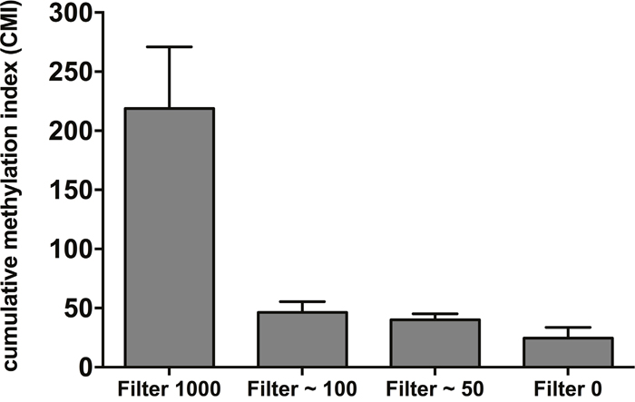 Next, blood samples from healthy controls were spiked with varying amounts of MCF7 (50-1000) cells and blood was then subjected to CTC enrichment with the size-based microfilter. Considering the analytical LOD of pyrosequencing (in general between 1 and 5%), the lowest number of spiked cells was 50 cells in 7.5ml blood (corresponding to about 6 cells per ml blood). After CTC capture, DNA was extracted, bisulfite-converted and tested by pyrosequencing for the 9-gene panel, excluding HIST1H3C, which is not methylated in MCF7 cells. Calculated CMI values were higher in all samples spiked with MCF7 cells compared to the unspiked sample (Figure 1), demonstrating the technical feasibility of the size-based microfilter for multigene methylation analysis.