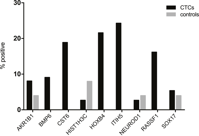 Figure 3: CST6, HOXB4, ITIH5 and RASSF1 are more frequently methylated in CTCs from metastatic breast cancer patients (black bars) compared to MNCs from healthy controls (grey bars). Samples were defined as positive when the mean methylation value for a sample was higher than the calculated cut-off value for the same gene.