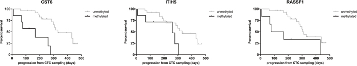 Figure 4: Impact of CTC methylation on progression-free survival (PFS) in metastatic breast cancer patients. PFS for patients with CST6, ITIH5, and RASSF1 methylation. black line, CTCs methylated, grey line, CTCs unmethylated.