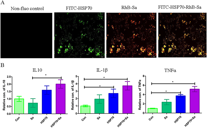 Figure 1: Identification of the interaction of TPMs with HSP70/Sa antigen. (A) Confirmation of the interaction of HSP70, Sa and HSP70+Sa with TPMs by fluorescence of FITC and RhB. (B) QPCR examination of three genes that indicating the activation of TPMs after the stimulation of HSP70, Sa and HSP70+Sa.