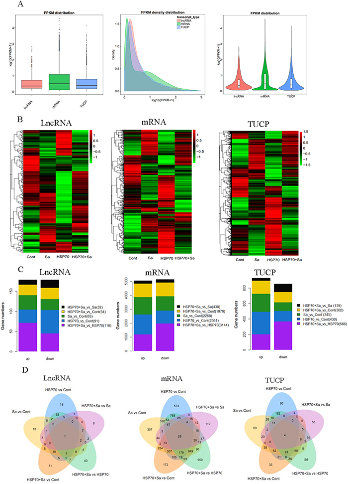 Figure 3: Gene quantification, expression profiling and number of differentially expressed genes. (A) Quantification of transcripts obtained from tilapia peritoneal macrophages (TPMs) treated with Sa and HSP70, respectively. (B) Heatmaps of the transformed expression values for transcripts (lncRNA, mRNA and TUCP). (C) Statistics of differentially expressed lncRNA, mRNA and TUCP in five comparison groups (HSP70 vs Cont, Sa vs Cont, HSP70+Sa vs Cont, HSP70+Sa vs HSP70 and HSP70+Sa vs Sa). (D) Venn diagram of differentially expression genes in five comparison groups.