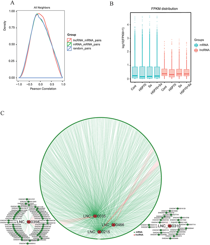 Figure 5: Correlation of expression patterns between pairs of target genes. (A) Shown are distributions of Pearson correlation coefficients in expression levels between either 400000 pairs of coding gene neighbors (green), 100000 pairs of lncRNAs (red) and 800000random pairs of genes (blue). (B) Box plots showing the expression feature of lncRNA and mRNA in each samples. (C) Shown are networks of five selected lncRNAs that associated with both cis and trans relationship with mRNAs. Red line represents cis relationship, green line represents trans relationship. Red circle represents lncRNAs and dark green circle represents mRNAs.