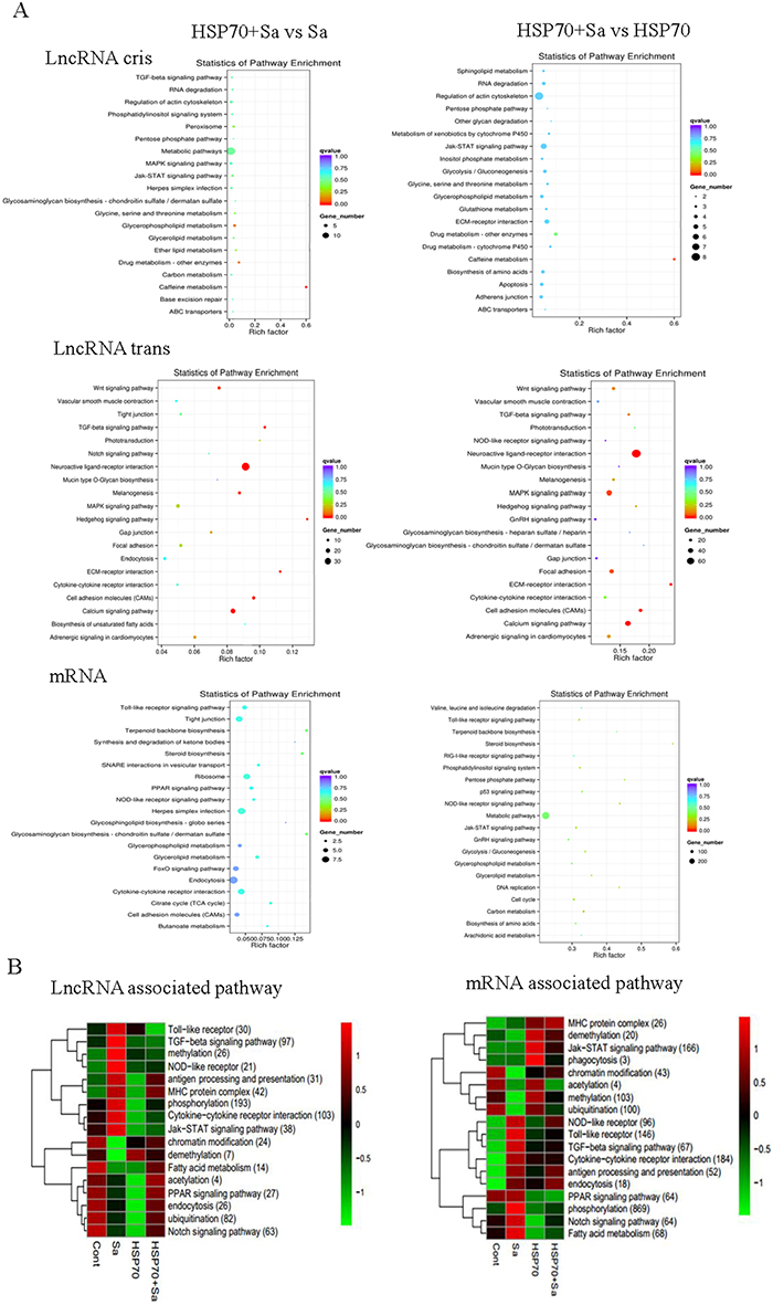 Figure 6: KEGG pathways involved in process of tilapia peritoneal macrophages (TPMs) stimulated with Sa and HSP70, respectively. (A) Pathways involved in two important comparison groups (HSP70+Sa vs Sa, HSP70+Sa vs HSP70) in lncRNAs and mRNAs category. (B) KEGG annotation of different expression lncRNAs and mRNAs that might be involved in macrophage activation process. The number in each annotation represents total counts of genes that might be involved in the pathway in all four comparison groups.