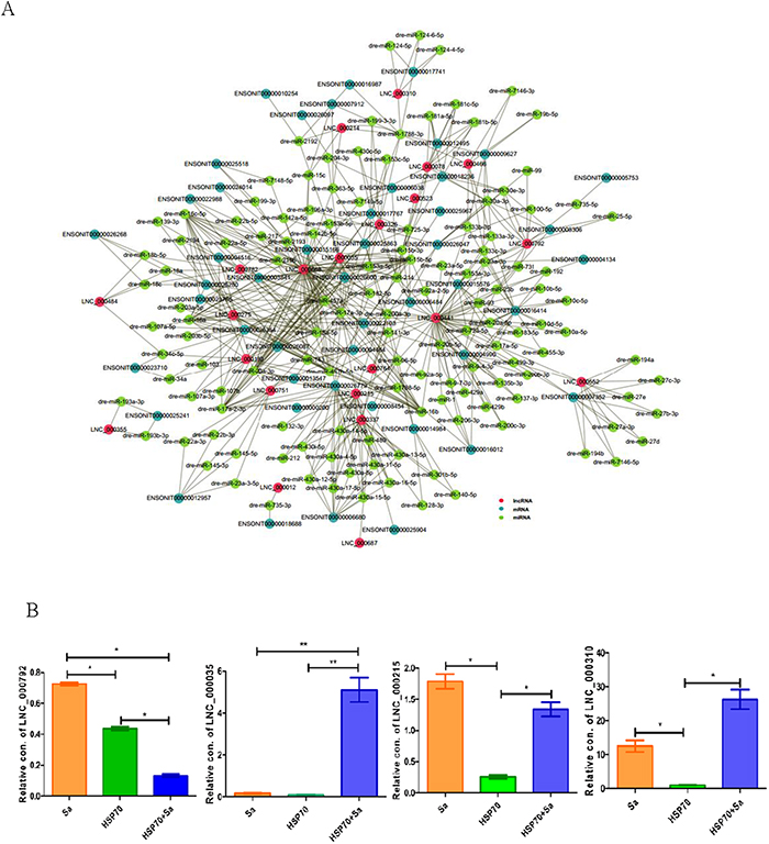 Figure 7: ceRNA networks and four lncRNAs involved both in cis and trans relationships. (A) The ceRNA network built from TPMs treated with Sa and HSP70, respectively. This ceRNA network including 130 miRNAs, 22 lncRNAs and 53 mRNAs that interact each other. Red circle represents lncRNAs, dark green circle represents mRNAs and green circle represents miRNAs that involved in ceRNA network. (B) QPCR identification of four lncRNA, LNC_000792, LNC_000215, LNC_000035 and LNC_000310 that found in the relationships of cis and trans of lncRNAs, and also involved in ceRNA network. The 2 ΔCt values of the lncRNAs were determined by subtracting the β-actin ΔCt value. * indicates p< 0.05.