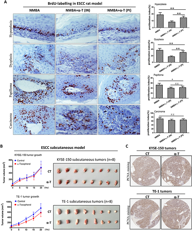 Figure 2: α-Tocopherol inhibited cell proliferation at early stage of ESCC but was not effective in established tumors. (A) Cell proliferation in rat esophageal epithelium determined by immunostaining of BrdU. Proliferation index of each lesion was calculated as the number of BrdU-positive cells divided by the total number of epithelial cells. Esophageal tissues were randomly selected from 12 rats in each group and used for analysis (n=12). (B) The tumor growth curve in subcutaneous models generated with esophageal cancer KYSE-150 and TE-1 cells. (C) IHC staining of PCNA in subcutaneous tumors. Data are shown as mean ± standard deviation, * signifies p<0.05; **, p<0.01; N.S. not significant.
