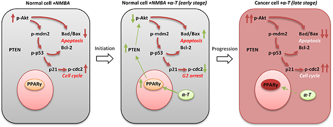 Figure 8: Schematic illustration of the chemopreventive effect of α-Tocopherol at the early stage of esophageal carcinogenesis. (1) NMBA induces Akt activation in esophageal epithelium cells, resulting in the acceleration of cell cycle and the inhibition of apoptosis. (2) At the early stage of carcinogenesis, α-Tocopherol effectively increases the expression of PPARγ and PTEN, which attenuated the activation of Akt signaling pathway leading to cell cycle arrest and enhanced cell apoptosis. α-Tocopherol is effective in ESCC prevention during this stage. (3) As the pathologic lesions progressed (late stage), PPARγ and Akt become constitutively activated and insensitive to α-Tocopherol. Supplementation with α-Tocopherol at this stage is not effective for ESCC prevention.
