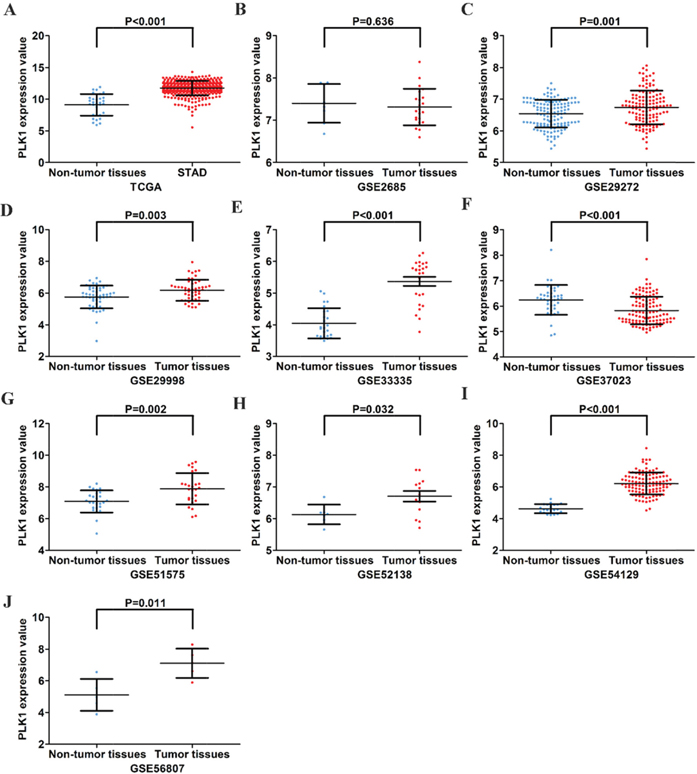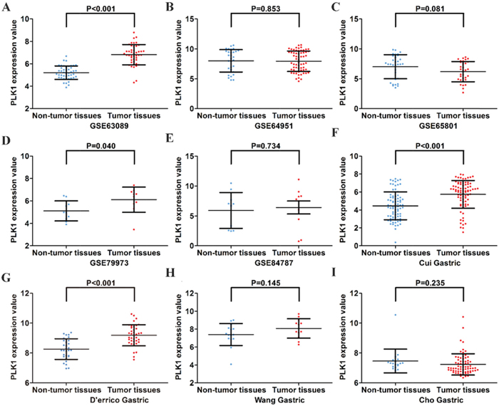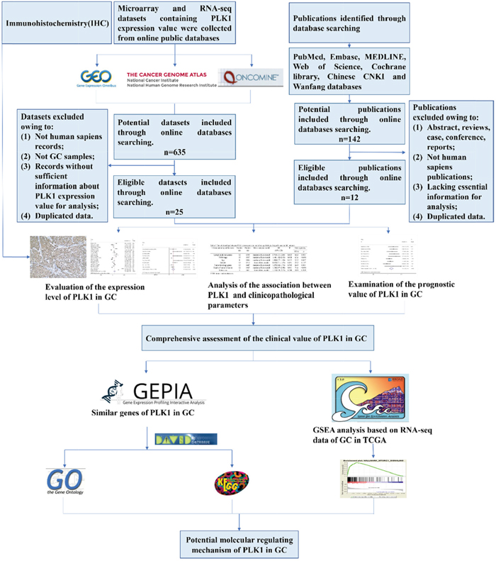 For microarray and RNA-seq datasets, eligible records were included if they fulfilled all of the principles as follows: (1) there was a proven diagnosis of GC in humans; (2) data included expression profiling data of PLK1 in GC and could be used for analysis; (3) the number of samples included in each record containing PLK1 expression value in tumor and non-tumor was not less than 10; and (4) the records used for analyzing the clinicopathological significance of PLK1 included more than 30 samples.