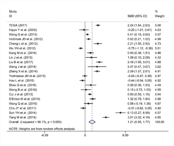 The first intention of the study was to clarify the expression pattern of PLK1 in GC. As expected, a pooled SMD reached 1.21 (95% CI: 0.65-1.77, P<0.001) presented by the random-effects model and no publication bias was observed. Similar to PLK1 mRNA, the pooled OR also revealed remarkably increased expression of PLK1 protein in GC, in comparison to normal gastric tissue. Furthermore, a robust ability of PLK1 to distinguish cancer from non-cancerous gastric tissues was observed via ROC (AUC: 0.86; 95% CI: 0.82–0.88, P<0.001). These demonstrated that the expression levels of PLK1 in GC tissues were significantly overexpressed. As a consequence, PLK1 might act as a cancer promoting factor and participate in GC tumorigenesis.
