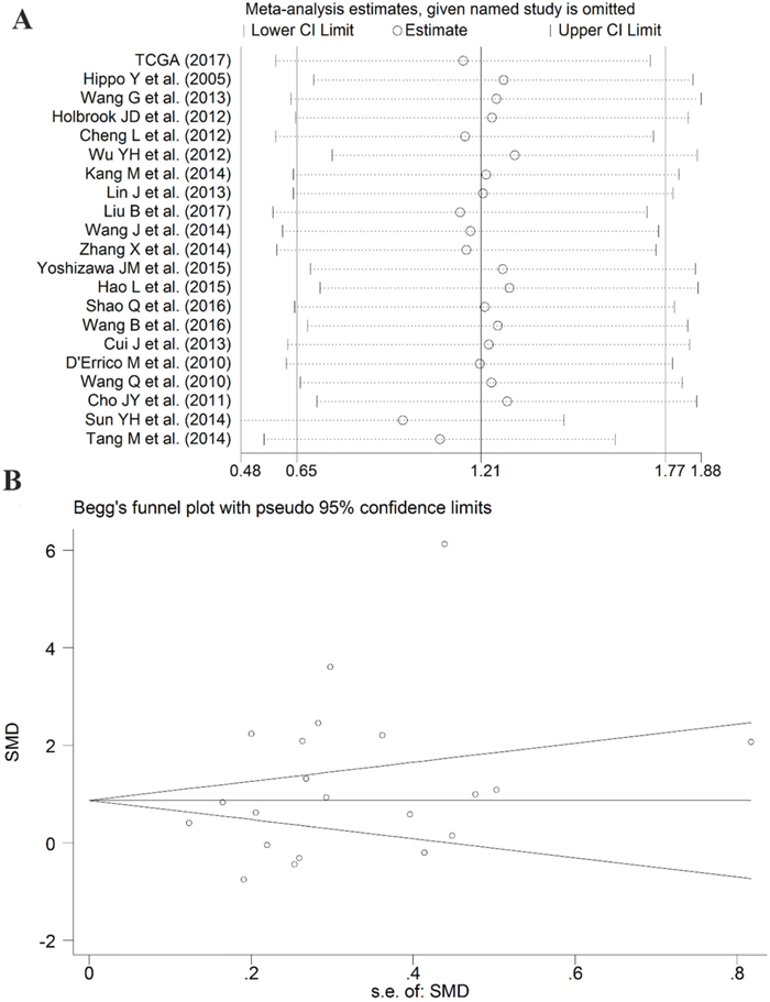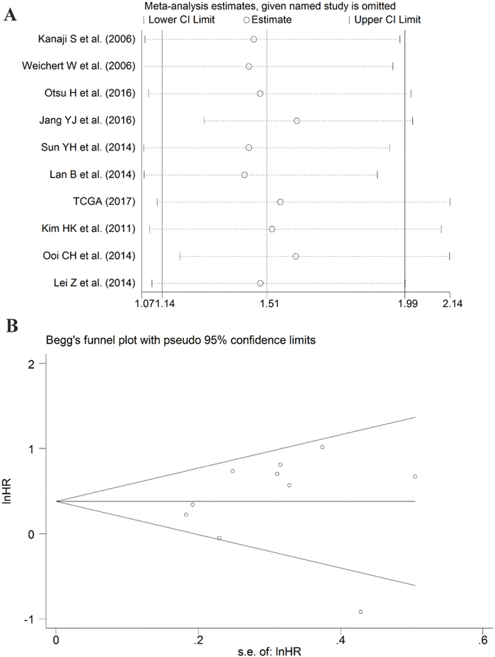 Chi-squared-based Q-test and I-square (I2) tests were carried out to analyze the heterogeneity across studies [48]. I2 >50% or a P value less than 0.05 indicated heterogeneity among studies. We selected the method of a fixed effect model or a random effect model according to the heterogeneity analysis. To ensure the robustness of results, sensitivity analyses were performed by sequentially omitting individual studies to evaluate the impact of each dataset on the pooled results. Additionally, Begg’s funnel plots and Egger’s test were applied to determine the publication bias. If P>0.05, there was no significant publication bias. All above calculations were calculated by SPSS 20.0 (IBM, New York, USA) and Stata12.0 (Stata Corporation, College Station, TX, USA).