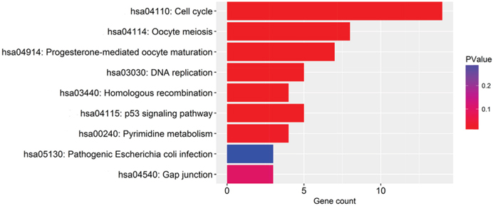 Figure 14: The significantly enriched annotation of the Kyoto Encyclopedia of Genes and Genomes pathway analysis of the genes relevant to PLK1 in GC.