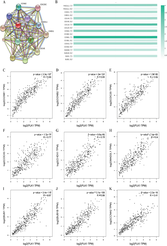 To further insight into the molecular mechanism of PLK1, we used a functional protein network database STRING to construct the PPI network. Through the constructed PPI network, nine hub genes of PLK1 were obtained (Figure 15A). These genes were MAD2L1, CHEK1, CDC45, CDC20, CCNB2, CCNB1, CCNA2, BUB1B and BUB1. Then, we also provided expression matrix plots of these hub genes (Figure 15B). Furthermore, the correlations between PLK1 and hub genes were calculated (Figure 15C-15K). These nine genes were positively correlated with PLK1.