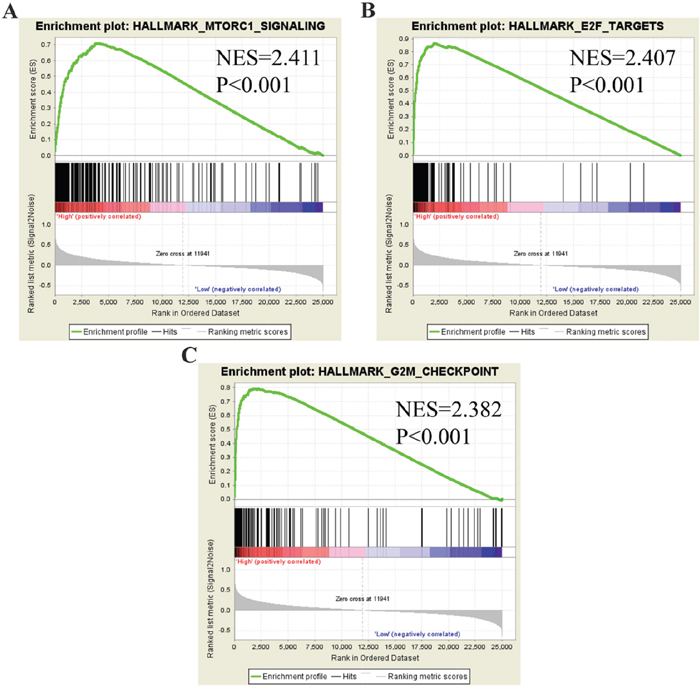 Figure 16: GSEA plot showing that PLK1 expression positively correlated with the three most significant enrichment sets. (A) MTORC1 signaling; (B) E2F targets; (C) G2M checkpoints.