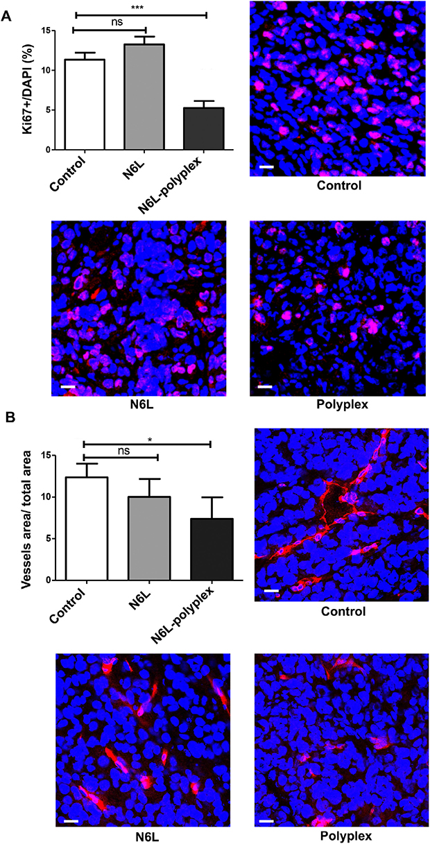 Figure 4: Effect of N6L-polyplexes on tumour proliferation and vascularisation. Frozen tumour sections were fixed, saturated with BSA 3% for 1 h at room temperature, and incubated with anti-ki67 (A) or anti-MECA32 (B). After washing, sections were incubated with anti IgG Alexa Fluor-555. Nuclei were stained with DAPI, and immunofluorescence images were captured by confocal microscopy. Acquisitions were carried out on multiple tissue sections (5 field per mouse, n = 5), and quantification analysis was performed by the ImageJ sofware.