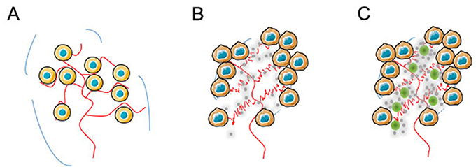 Figure 7: Illustration of a possible mechanism for tumour bioavailability based on N6L-polyplexes. In the light of our accumulated data, the enhancement in antitumour efficacy for N6L in a polyplexed form compared to N6L used alone could be explained by EPR effect. In normal pancreas (A) in which lymphatic clearance occurs, and nucleolin expression at the cell surface of endothelial cells from normal vessel does not whatever the N6L formulation injected, no retention of N6L in the tissue could be observed (see Figure 6C and 6F). (B) In contrast, administration of N6L alone (grey circles) to animals bearing pancreatic tumour localizes into tumour tissues (Figure 6E and 7B) in which high expression of nucleolin had been observed [8]. (C) When N6L-polyplexes were administered (green and grey circles), it can be assumed that N6L nanoparticles are concentrated by the EPR effect to the tumour microenvironment, increasing N6L bioavailabilty for the tumour as shown in Figure 6A and 6B.