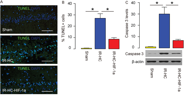 TUNEL staining was then performed on the rat brain at analysis. We found that while nearly no TUNEL-positive cells were found in the hippocampus in the Sham group, an increased number of TUNEL-positive cells were detected in the IR+HC group. HIF-1a significantly reduced the number of TUNEL-positive cells, shown by representative images (Figure 2A), and by quantification (Figure 2B). Moreover, a key protein for apoptosis, cleavage caspase 3, was significantly upregulated in the brain from IR+HC group and the IR+HC-HIF-1a group, compared to the Sham group. HIF-1a significantly decreased the levels of cleavage caspase 3 by IR, analyzed by Western blot (Figure 2C). Together, these data suggest that augmentation of HIF-1a may attenuate rat brain cellapoptosis after IR.