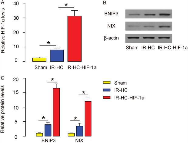Figure 4: IR induces HIF-1a and its two target genes BNIP3 and NIX in rat brain. (A-C) The levels of HIF-1a (by ELISA, A), BNIP3 and NIX (by Western blot, B-C) were examined in rat brain tissue (Sham group, IR+HC group and IR+HC-HIF-1a group) after IR. N=20. *p<0.05.