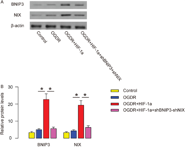 Then we used in vitro experiment to study the underlying mechanisms. Ischemic-like conditions for IR were mimicked by using oxygen-glucose deprivation and reperfusion (OGDR) in vitro. A human cortical neuron cell line, HCN-1A, was used. Cells that were not exposed to OGDR were used as controls. HIF-1a was induced in HCN-1A through transfection of cells with a HIF-1a-expressing plasmid under CMV promoter. HIF-1a was also transfected with a scrambled plasmid as a control. Depletion of the BNIP3 and NIX expression was achieved through transfection of the cells with shRNA for both (shBNIP3+shNIX). Four groups of the cells were compared: Group 1, scrambled plasmid transfected cells, no OGDR (Control); Group 2, scrambled plasmid transfected cells, OGDR (OGDR); Group 3, HIF-1a-transfected cells, OGDR (OGDR+HIF-1a); Group 4, HIF-1a/shBINP3/shNIX-transfected cells, OGDR (OGDR+HIF-1a+shBNIP3+shNIX).