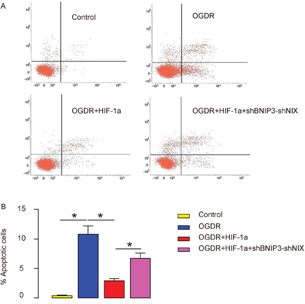 Figure 6: HIF-1a attenuates OGDR-induced brain cell apoptosis via BNIP3 and NIX in vitro. (A-B) Cell apoptosis was analyzed by flow cytometry-based FITC Annexin V Apoptosis Detection Assay, shown by representative flow charts (A), and by quantification (B). *p<0.05. N=5.
