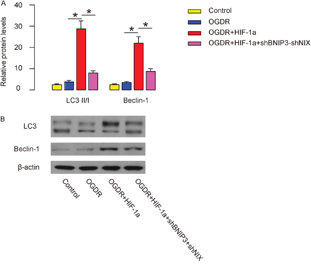 Figure 7: HIF-1a enhances OGDR-associated brain cell autophagy via BNIP3 and NIX in vitro. (A-B) Cell autophagy was analyzed. LC3II/I and Beclin-1 were analyzed by Western blot, shown by quantification (A), and by representative Western blots (B). *p<0.05. N=5.