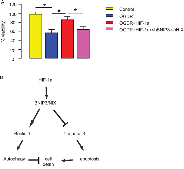 Figure 8: HIF-1a increases brain cell survival via BNIP3 and NIX in OGDR in vitro. (A) Cell viability in a CCK-8 assay. (B) Schematic of the model: During IR, HIF-1a may have its protective effects through affecting brain cell apoptosis and cell autophagy, in a BNIP3 and NIX –dependent manner. *p<0.05. N=5.