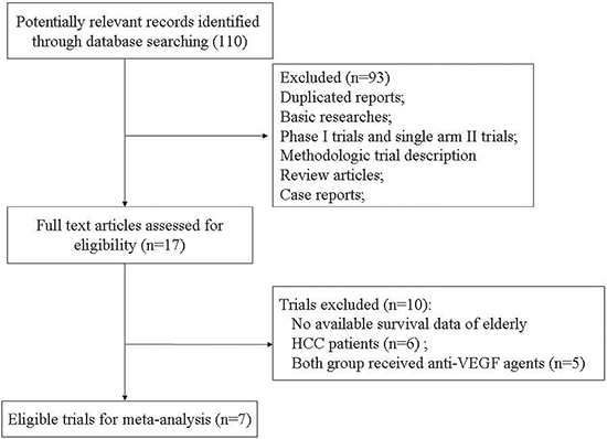 Clinical trials that met the following criteria were included: (1) randomized controlled phase II and III trials in patients with HCC; (2) participants assigned to treatment with or without anti-VEGF agents; (3) survival data of elderly patients were available;